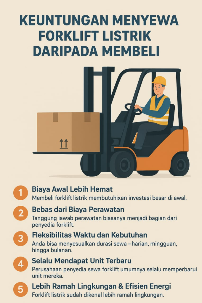 Bagi banyak perusahaan, terutama yang ingin menghemat biaya operasional tanpa mengorbankan produktivitas, menyewa forklift listrik sering kali menjadi pilihan paling cerdas. Berikut alasan dan keuntungannya: